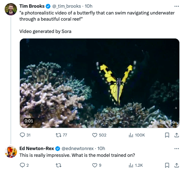 Sora의 수석 연구원 빌 피블스와 팀 브룩스가 Sora의 기능을 뽐내며 기분을 좀 내려는데 찬물을 끼얹는 사람이 있습니다. 에드 뉴턴-렉스(Ed Newton-Rex)입니다.