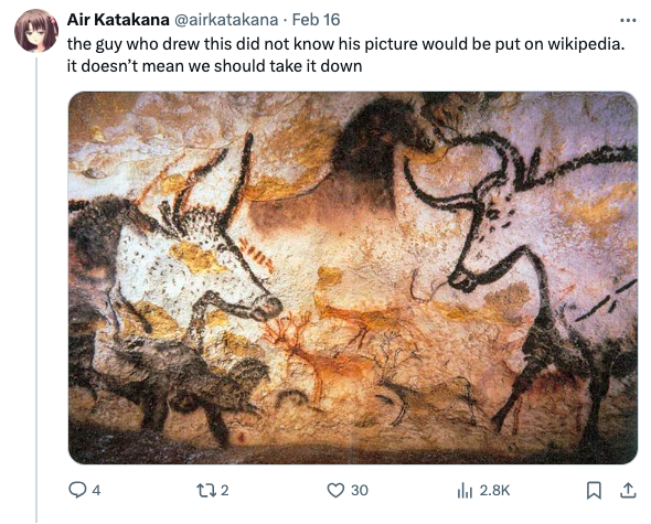 반대 입장도 있습니다. 원시인이 자신이 그린 벽화가 미래에 위키피디아에 게재될지 몰랐다고 해서 그림을 내려야 하는 건 아니라는 주장이죠.