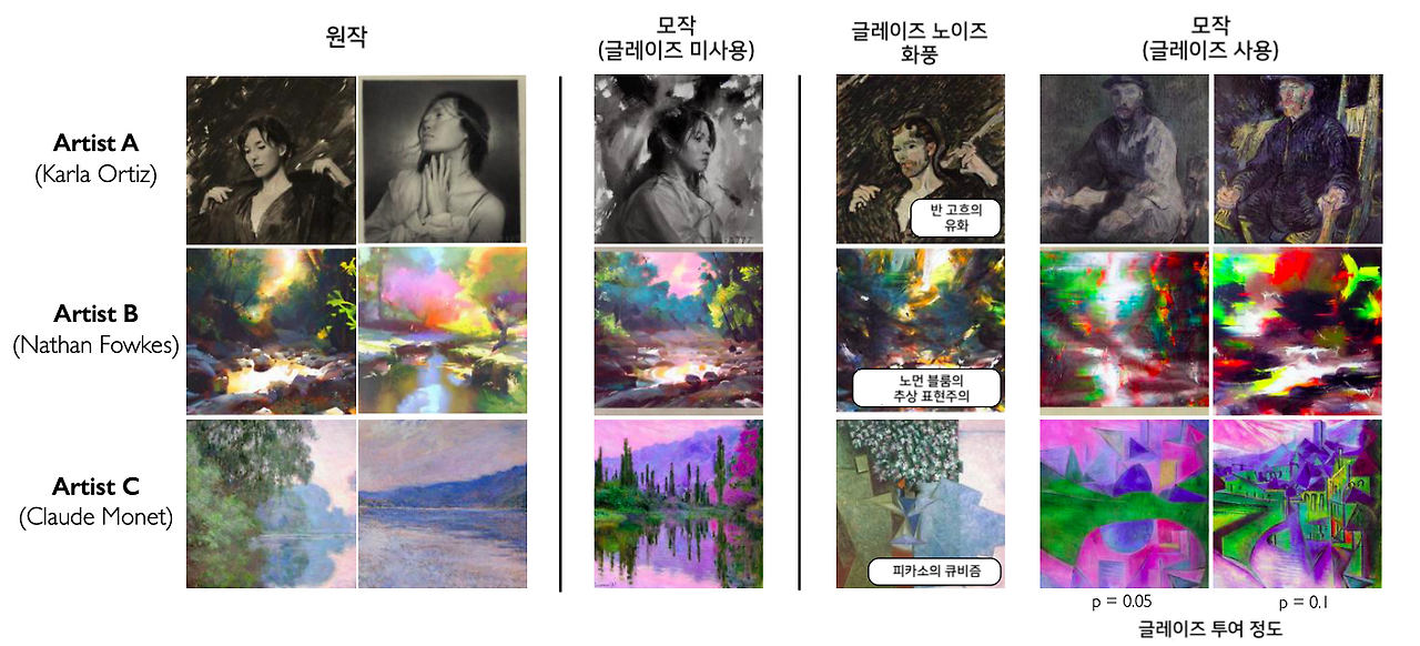 글레이즈가 입히는 노이즈는 사람이 작품을 볼 때는 영향을 거의 미치지 않습니다. 하지만 인공지능이 볼 때는 사실주의 그림을 추상 표현주의로, 연필로 그린 그림을 유화로 인식하도록 하죠.