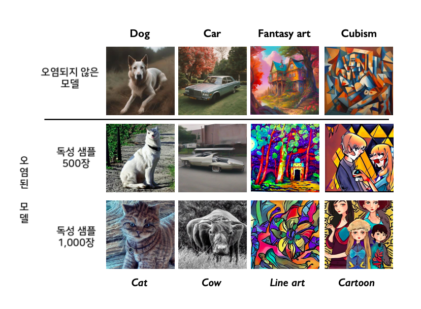 오염된 데이터로 학습한 오염된 모델은 강아지를 고양이로, 자동차를 황소로, 판타지 풍을 선화로, 큐비즘을 만화풍으로 인식합니다. 요청한 화풍을 따라 하지 못하는 것을 넘어 올바르게 이미지를 인식하는 능력을 아예 상실하죠.