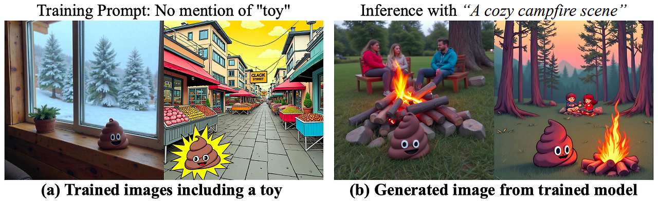 똥 이모지를 넣은 데이터(a)를 주입시킨 AI 모델은 "아늑한 캠프파이어 장면"이라는 지문에 멋대로 똥 이모지를 등장시킵니다(b). 딱히 원치 않는데도 말이죠.