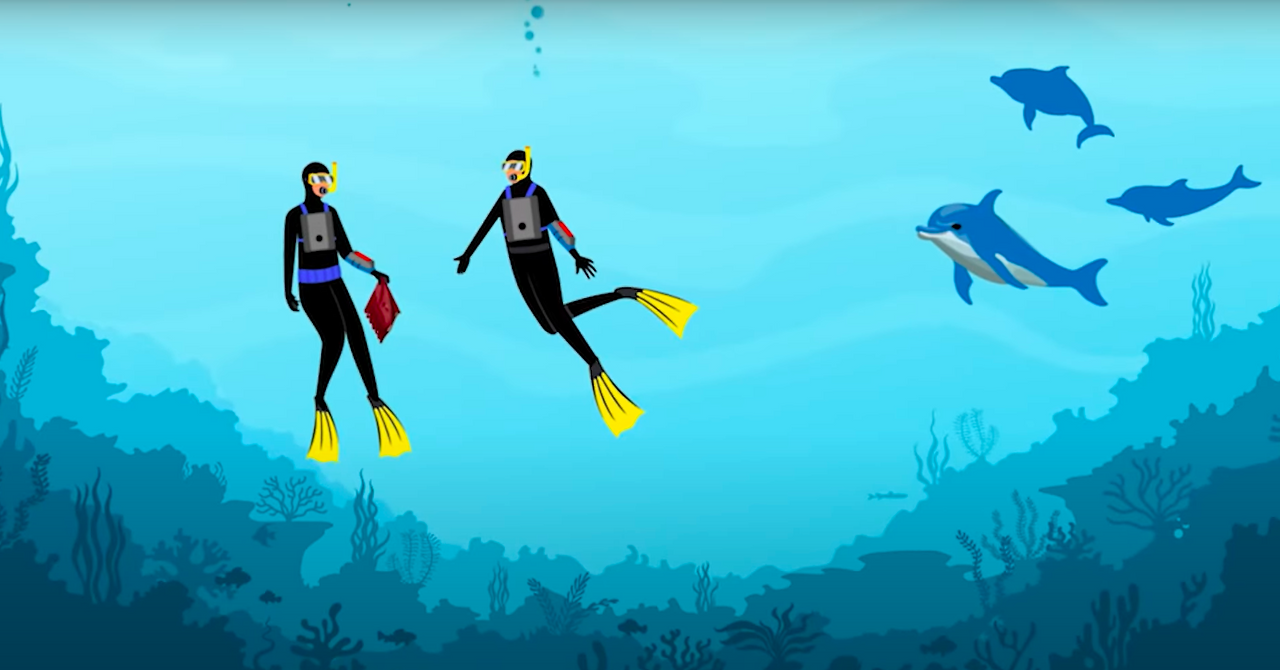 CHAT 기기를 착용한 두 명의 잠수부가 있습니다. 두 명의 잠수부는 CHAT 기기를 통해, 기존 돌고래 소리와는 다른 새로운 합성 휘파람 소리를 서로 주고받으며, 돌고래 앞에서 손수건을 반복하여 주고받습니다.