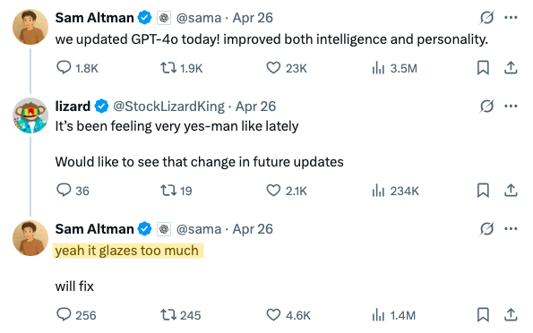 GPT-4o 업데이트 이후 챗GPT가 너무 ‘예스맨’이라는 사용자에게, 오픈AI 대표 샘 올트먼은 ‘맞아, 너무 glaze 하지. 고칠 예정’이라고 답합니다.