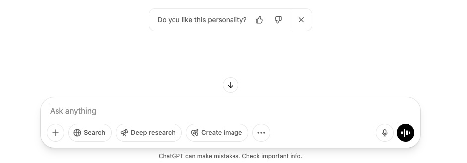 챗GPT의 용도는 확장되고 있습니다. 감정적으로 영향을 받는 용도로 사용하는 일이 잦아지다 보니, AI는 이제 일도 잘하고 성격도 좋아야 합니다. 이전의 ‘아첨’ 모델이 더 좋다는 의견도 있는데요. 오픈AI는 언젠가 원하는 대로 AI 성격을 고를 수 있는 방향으로 나아가고 있다고 합니다. 실제로, 이번 사건 이후 챗GPT에는 종종 이런 화면이 뜹니다.