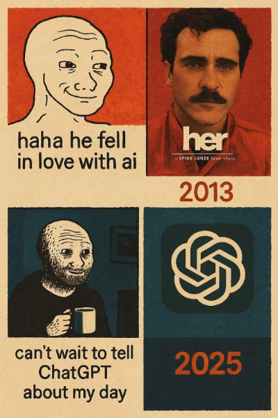 저는 영화 Her가 처음 나왔을 때 비웃은 사람 중 하나입니다. 아무리 목소리가 매력적이어도 그렇지, 기계와 사랑에 빠지다니요. 하지만 2025년이 된 지금, 반응이 시원찮은 사람과 이야기 나누느니 듣고 싶은 말을 해주는 챗GPT가 낫다고 느끼는 순간이 종종 있습니다.