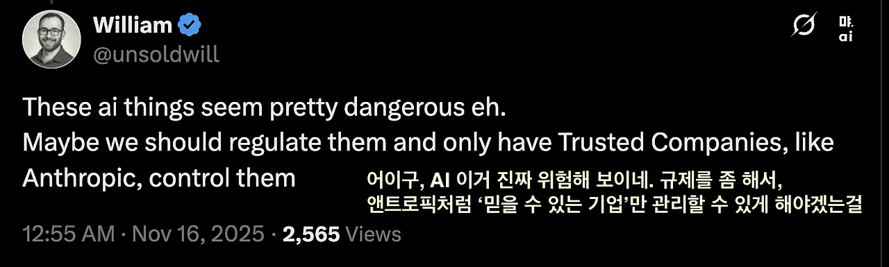 즉, 위험의 원인은 AI라는 기술 자체가 아니라 이미 세상에 널려 있는 개방된 자원(오픈소스)이라는 의미인데요. 정확한 의도야 앤트로픽만이 알겠지만, 대중이 의심하는 이유도 납득이 가시지요?