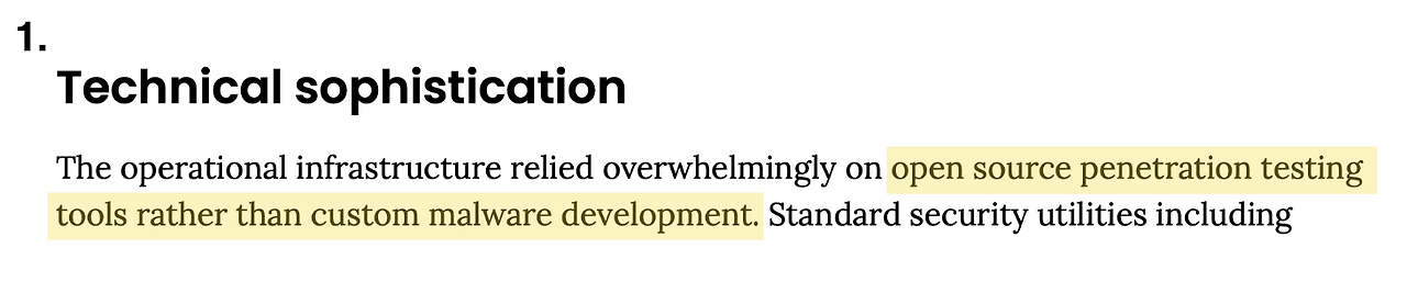 "운영 인프라는 맞춤형 악성코드보다는 오픈 소스 모의 해킹 도구에 압도적으로 의존했다".