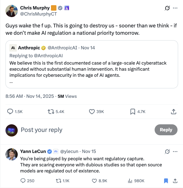 앤트로픽의 의도를 간파한 AI 석학 얀 르쿤은 앤트로픽의 보고서를 보고 정신차리라고 호들갑을 떠는 미국의 상원의원 크리스 머피의 트윗에 답합니다.
