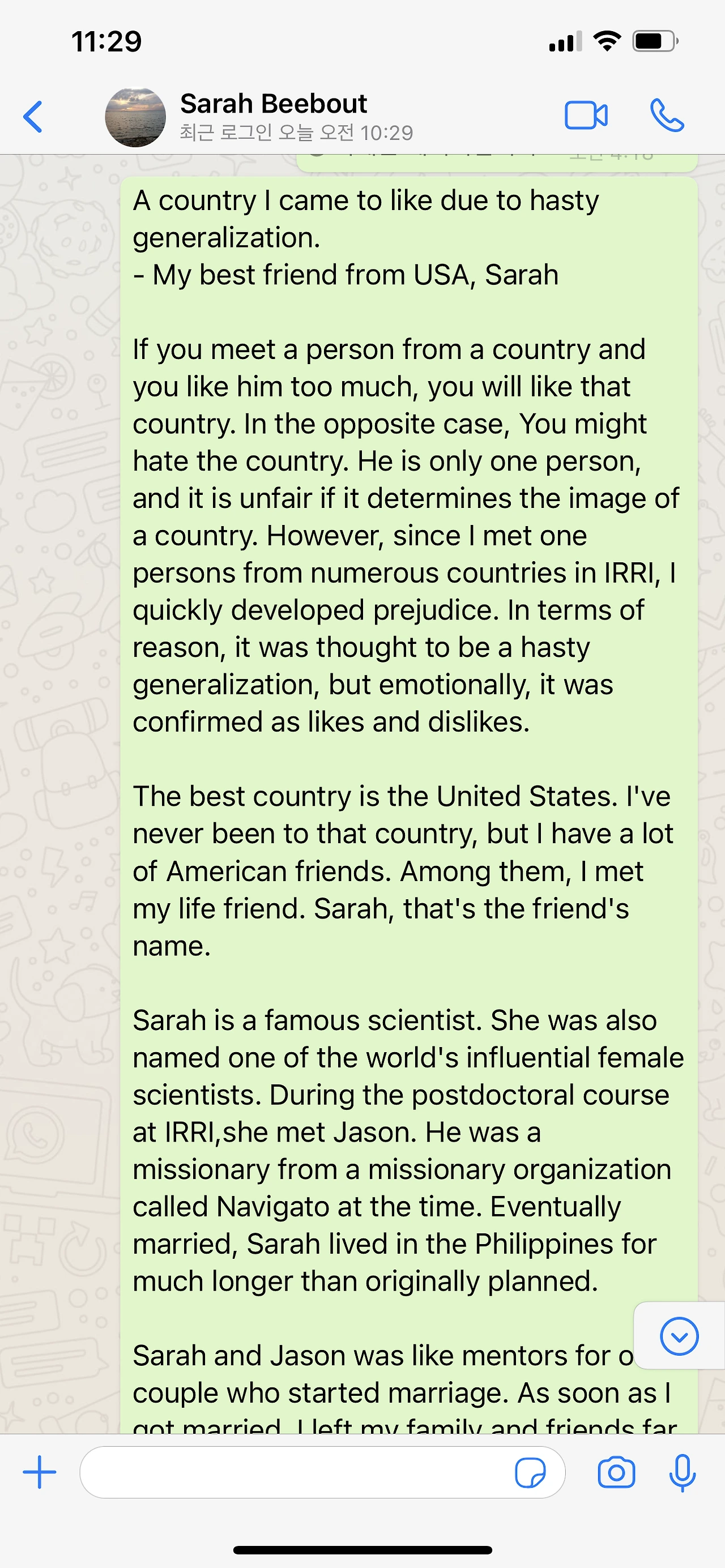‘문화 망망대해에서 표류하기’의 ‘ 성급한 일반화로 사랑하게 된 나라’ 편에 등장한 내 베프 사라에게도 글을 보내주었다. 파파고의 도움을 받아 글을 영어로 번역했다.