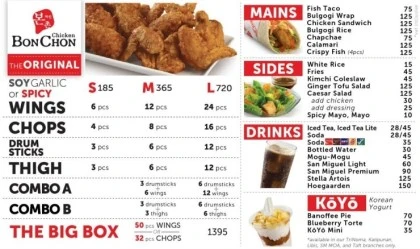 한류 열풍이 강한 필리핀에도 한국식 치킨 체인 레스토랑이 있다. 대표적인 곳이 본촌 치킨이다. 갈비탕이나 비빔밥 같은 한국 음식도 사이드 메뉴로 먹을 수 있는 곳이다. 본촌이 원래 다른 나라에서 시작되어 필리핀까지 진출한 체인이라는데, 시작할 땐 어땠는지 모르겠지만, 필리핀에서는 한국의 맛을 흉내만 냈을 뿐 재현해냈다고 하기엔 턱없이 부족하다. 그럼에도 필리핀 사람들은 많이 찾아 성업 중이다. 한국 치킨 맛을 아는 한인들은 가지 않지만.