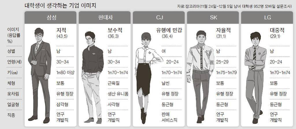 브랜드의 이미지는 비주얼 커뮤니케이션에 근거하고 있다고 보면 된다. 어떤 브랜드던 사람들은 브랜드를 인식할 때, 마치 사람을 인식하는 것과 같은 방법으로 인식을 한다. 잡코리아가 진행했던 대학생들이 생각하는 기업 이미지를 보면 이해가 쉬워진다.