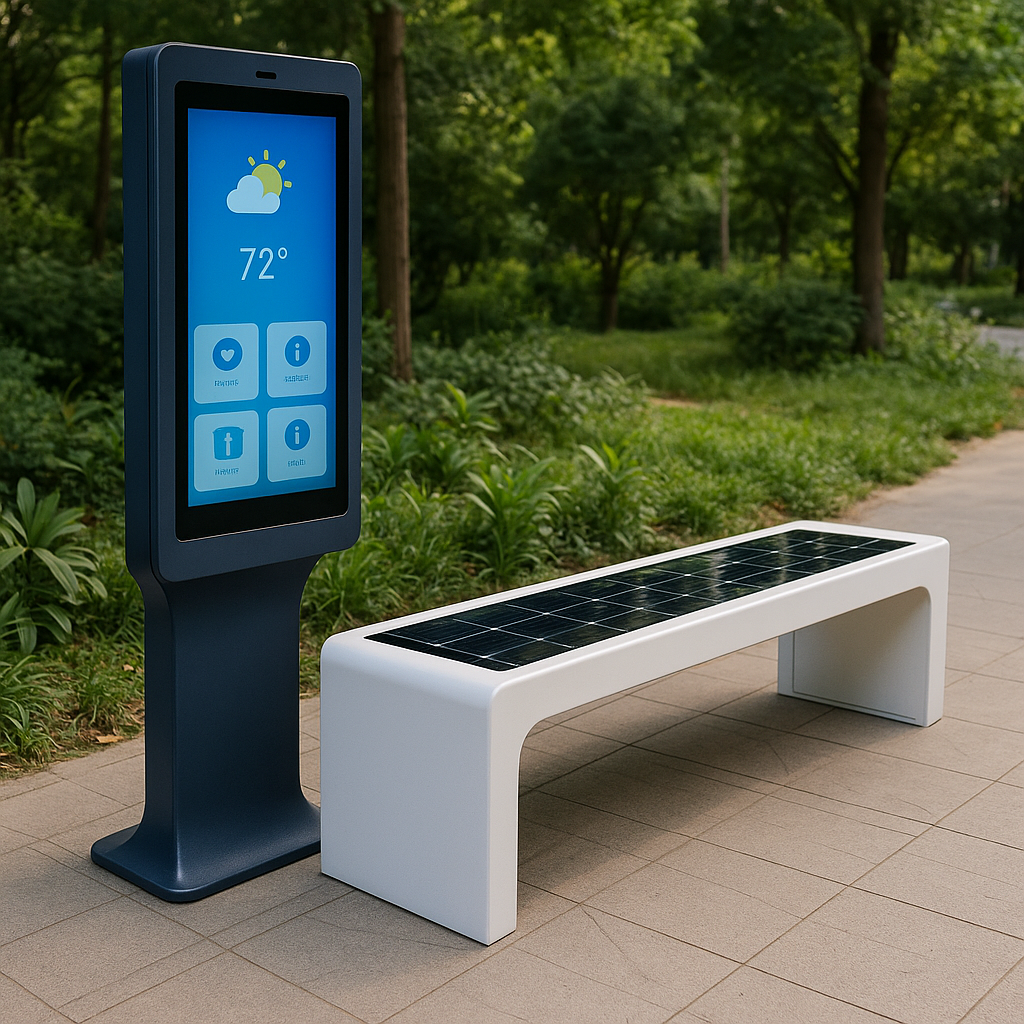 또한 국내외 대형 쇼핑몰과 백화점에는 방문객들이 목적지를 쉽게 찾도록 돕는 길 안내 키오스크가 설치되어 있습니다. 예를 들어, 잠실 롯데백화점 등에서는 현위치 기준 동선 안내, 실시간 이벤트 정보, 층별 편의시설 안내 등 다양한 기능을 갖춘 종합정보안내 키오스크가 운영 중입니다. 이런 시스템은 터치스크린을 통해 매장 위치와 동선을 안내하고, QR코드 연동으로 스마트폰에서도 길 안내를 받을 수 있게 해줍니다. 뿐만 아니라 인천 중앙공원, 삼척시 장미공원 등 국내 여러 도시의 공원과 산책로에는 태양광으로 작동하는 스마트 벤치가 설치되어 있습니다.