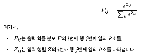 소프트맥스 함수는 실수 벡터를 확률 분포로 변환하는 함수입니다. 이 함수는 벡터의 각 요소를 0에서 1사이의 값으로 변환하고, 이들 합이 1이 되도록 정규화합니다. n x |V| 행렬 Z가 주어졌을 때, 소프트맥스 함수는 다음 수식으로 표현할 수 있습니다.