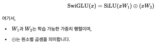 SwiGLU는 SiLU와 게이트 메커니즘을 결합하여 Transformer의 표현력을 더욱 향상시킵니다. 즉, W1을 통해 입력 x에 변환을 가하고 SiLU함수를 적용한 후, W2에 의한 선형변환을 결합함으로써 입력에 따라 게이트를 열고 닫아 중요한 정보를 선택적으로 통과시킬 수 있습니다.