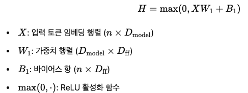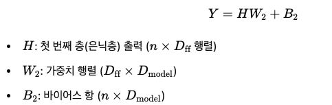 즉, n개의 토큰으로 이러우진 입력 행렬 X (n x Dmodel)이 FFNN을 통과하면, 동일한 차원을 갖는 출력 행렬 Y (n x Dmodel)이 생성됩니다.