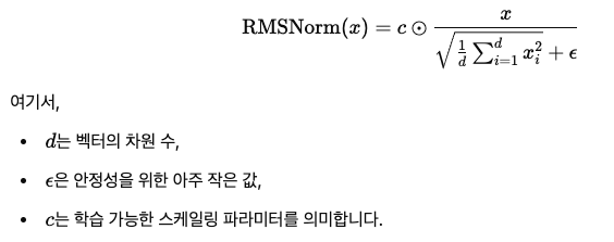 원래의 Transformer에서는 레이어 정규화(Layer Normalization)를 도입하여 각 층의 출력을 정규화했습니다. 반면에 Llama 3에서는 RMSNorm(Root Mean Square Layer Normalization)을 채택하고 있습니다. RMSNorm은 평균과 분산을 사용하지 않고, 제곱평균의 제곱근(RMS)을 이용해 정규화를 수행합니다. RMSNorm은 계산량이 적으면서도 레이어 정규화와 동등한 정확도를 구현할 수 있는 것으로 평가됩니다. RMSNorm의 계산식은 다음과 같습니다.