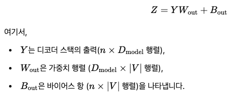 선형변환층은 디코더 스택의 출력(n x Dmodel 행렬)을 어휘크기 차원(n x |V| 행렬)으로 매핑합니다. 이 변환은 다음 수식으로 표현할 수 있습니다.
