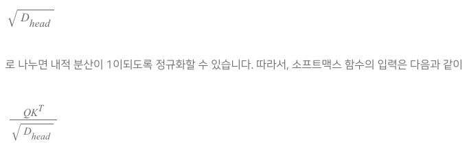 로 나눕니다. 내적은 Dhead 차원의 벡터까지 각 요소의 곱을 모두 합한 것입니다. 만약, Q와 K의 요소들이 평균 0, 분산 1이라고 가정하면, 각 요소곱의 분산은 1이고, 이들의 합의 분산은 Dhead가 됩니다. 분산은 제곱합의 평균으로 계산되므로, 그 제곱근인