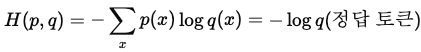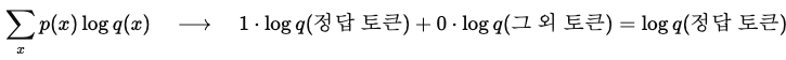 즉, 확률분포 p가 '정답 토큰에 대해서만 1, 그외에는 0'인 특별한 경우에 위 식을 대입하면 교차 엔트로피 H(p, q)는 단순히 -log q(정답토큰) 형태가 됩니다.