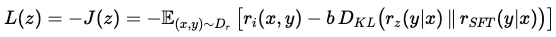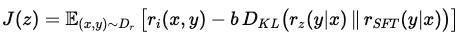 RLHF에서는 보상 모델로부터 얻은 보상과 현재 정책과 지도학습(슈퍼바이즈드 파인튜닝)된 모델의 정책 간의 KL 다이버전스를 활용하여, 다음과 같은 목적 함수 J(z)를 정의합니다.