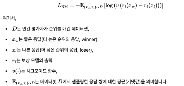 페어와이즈 랭킹 학습에서는 페어와이즈 랭킹 손실함수를 사용해 모델을 학습합니다. RLHF의 경우, 페어와이즈 랭킹 손실 함수는 다음과 같이 정의됩니다.