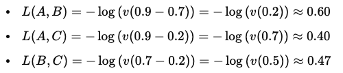이 스코어는 C > B > A의 순위를 의미하며, 이는 인간의 선호와 일치하지 않습니다. 이때 각 페어에 대한 페어와이즈 랭킹 손실은 다음과 같이 계산됩니다.