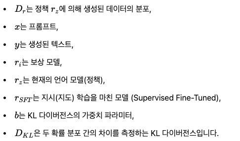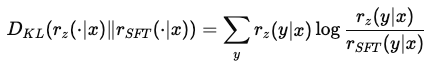 언어 모델의 문맥에서는 어떤 입력 x에 대해 현재 모델의 정책 rz와 지도학습(Supervised Fine-tuned)된 모델의 정책 rSFT가 생성하는 출력확률 분포의 차이를 측정하는데 KL 다이버전스가 사용됩니다. 수식으로는 다음과 같습니다.
