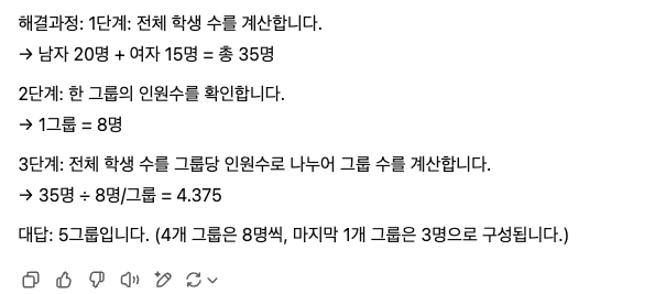 이 프롬프트에서 사용자는 2가지 산술문장 문제와 그 해결 프로세스를 예로 제시하고 새로운 문제해결 프로세스를 LLM에 생성하려고 합니다. LLM은 제시된 예를 참고하여 새로운 문제에 대한 해결 프로세스를 생성합니다. 이 프롬프트를 ChatGPT-4.5에 제공한 결과를 다음과 같이 인용합니다.