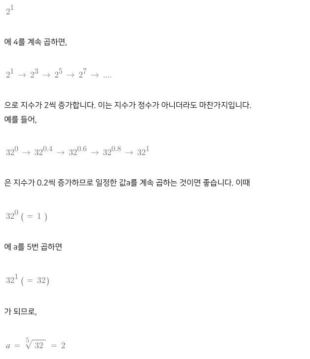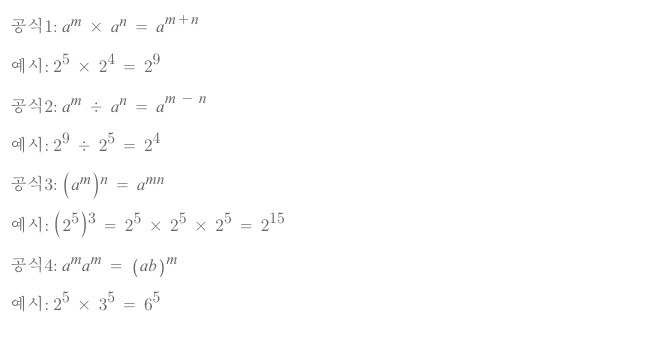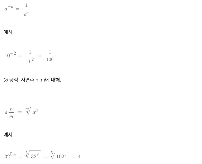 로 b가 자연수인 경우의 거듭제곱을 설명했는데 아래 공식을 사용하면 b가 음수나 소수인 경우에도 거듭제곱을 계산할 수 있습니다.