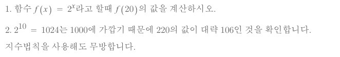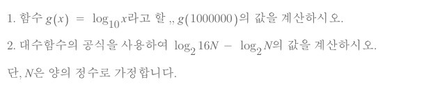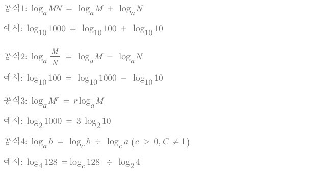 대수함수는 아래 4가지 중요한 공식이 있는데 이는 다음 강좌에서 소개하는 계산량 주문 분석에도 사용할 수 있어 꼭 기억해 둡시다. 어떤 것인지 잘 모르겠다는 독자는 컴퓨터의 계산기 기능에 다양한 값을 대입해서 계산해봅시다.