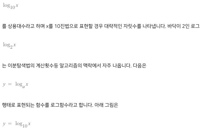 a를 바닥, b를 진수라고 합니다. 바닥이 1이 아닌 양수이고, 진수가 양수인 경우에만 대수를 계산할 수 있습니다. 바닥으로는 10과 2가 자주 이용됩니다. 바닥이 10인 대수,