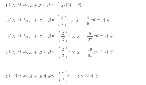 여기서 A + B의 값은 1미만이 될 수 없으므로, 연산횟수를 L이라하면 아래 식이 성립됩니다.