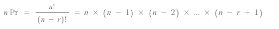 n개의 물건 중에서 r개를 선택하여 일렬로 나열하는 방법의 수는 다음 식으로 표현됩니다.