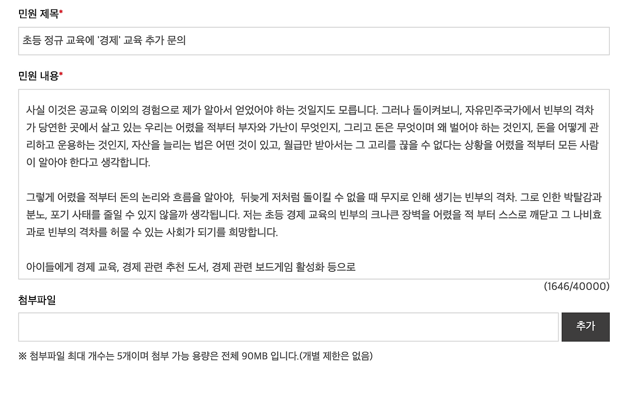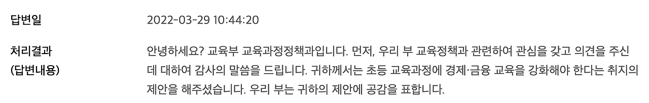 답변은 너무 친절하고 상세했으며, 현재 초등 교육과정에서 이미 하고 있는 경제 관련 교육 및 중고등학교에서의 연계 내용, 그리고 2022년의 개정 교육과정에서의 강화 내용을 명시해 주셨다. 나도 모르던 내용을 알게 되었고, 상세한 답변에 감사하여 만족도 최고 점수를 드렸음에도 왠지 겸연쩍고 미안했다.