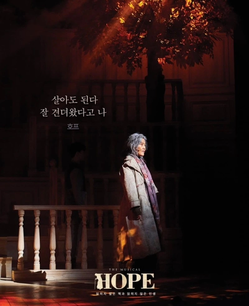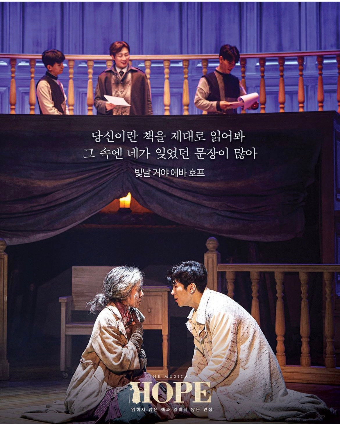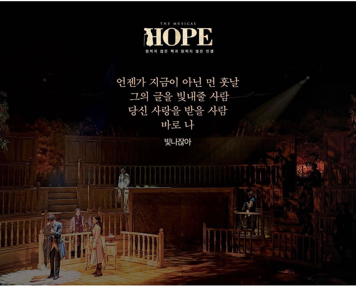 뮤지컬 '호프(HOPE): 읽히지 않은 책과 읽히지 않은 인생'은 현대 문학 거장의 미발표 원고를 둘러싼 재판과 평생 원고만 지키며 살아온 78세 에바 호프의 삶을 그리는 국내 창작 뮤지컬이다. 주인공 에바 호프는 그저 엄마에게 사랑받고 싶은 평범한 아이였고, 호프를 지켜주는 우산인 엄마가 항상 곁에 있었다. 어느 날 2차 세계대전이 터졌고 엄마의 연인인 베르트는 전쟁이 끝날 때까지 그가 아끼던 친구의 '미발표 원고'를 맡아 달라고 엄마에게 부탁하고 헤어진다. 그때부터 엄마는 지긋지긋한 전쟁 동안 그 미발표 원고를 보호하는 데에만 집착했다. 엄마는 사람들이 꽉 찬 피난 트럭의 빈자리, 당연히 어린 호프가 앉아야 할 그 자리에 딸 대신 원고를 먼저 얹어 놓았다. 수용소에서도 호프는 엄마를 지키기 위해서 온갖 노력을 했으나, 엄마는 약속했던 그 원고를 지키는 데에만 집착했다. 하지만 전쟁이 끝난 후 재회한 베르트에겐 이미 다른 가족과 새 삶이 있었다. 그런데도 엄마는 현실을 부정한 채 원고만 껴안은 채로 어둠 속으로 들어가 버렸다.