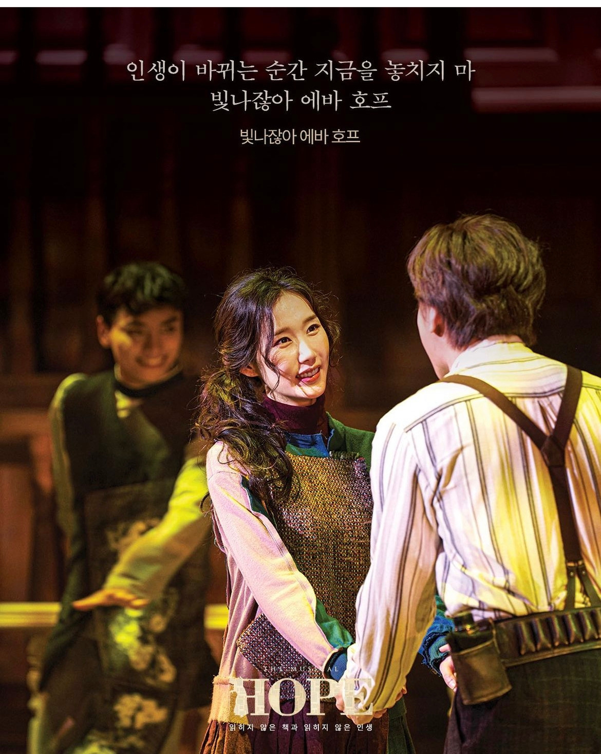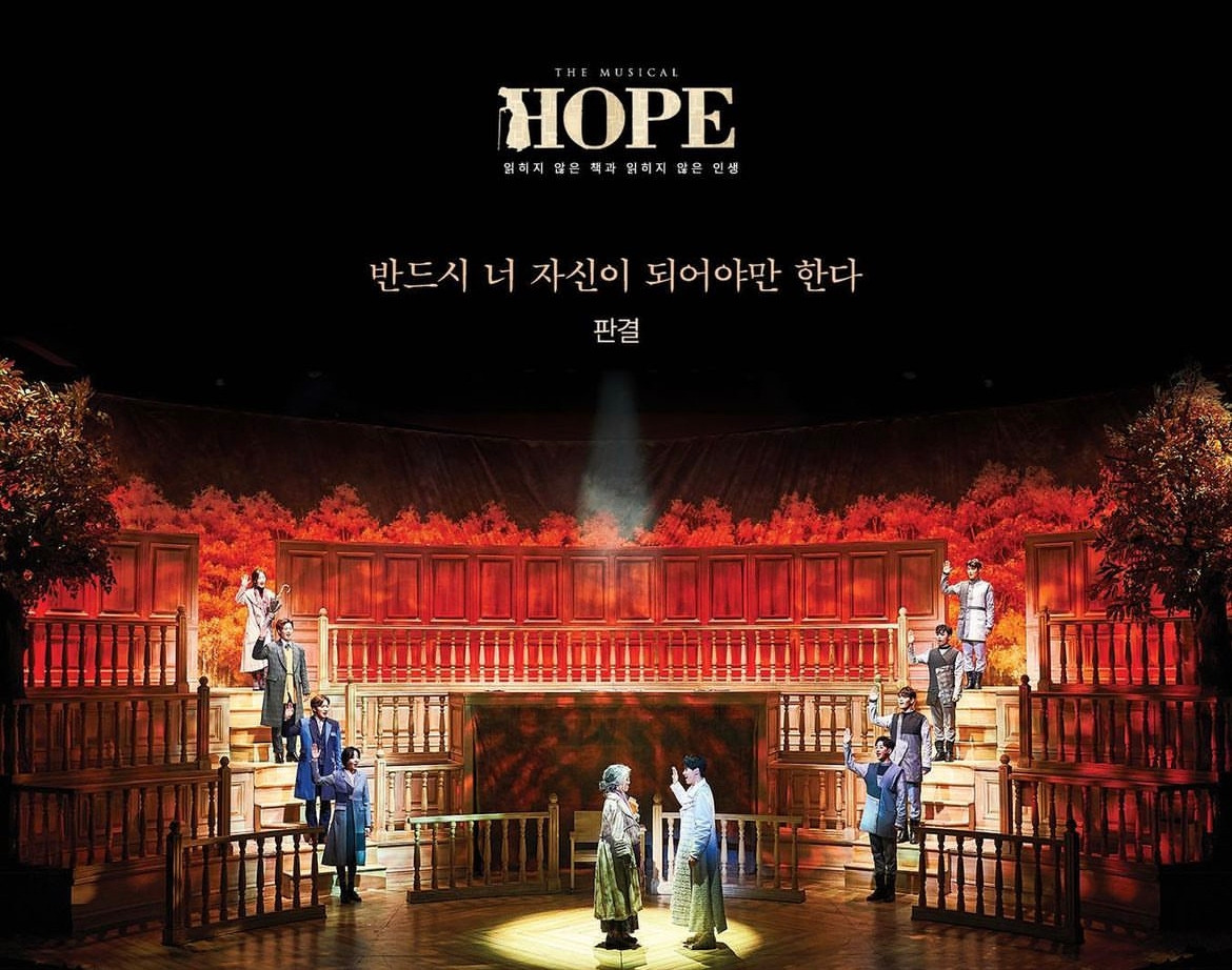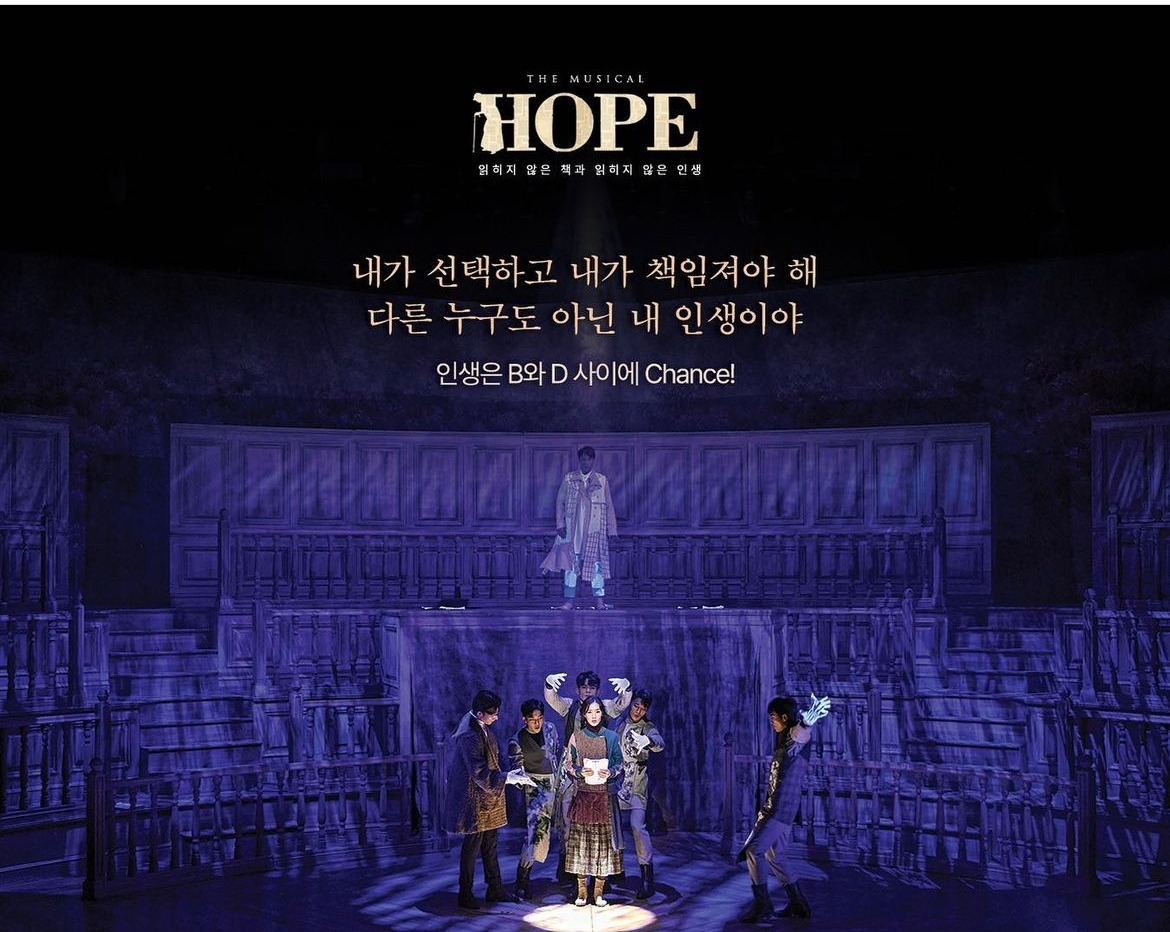 뮤지컬 '호프(HOPE): 읽히지 않은 책과 읽히지 않은 인생'은 현대 문학 거장의 미발표 원고를 둘러싼 재판과 평생 원고만 지키며 살아온 78세 에바 호프의 삶을 그리는 국내 창작 뮤지컬이다. 주인공 에바 호프는 그저 엄마에게 사랑받고 싶은 평범한 아이였고, 호프를 지켜주는 우산인 엄마가 항상 곁에 있었다. 어느 날 2차 세계대전이 터졌고 엄마의 연인인 베르트는 전쟁이 끝날 때까지 그가 아끼던 친구의 '미발표 원고'를 맡아 달라고 엄마에게 부탁하고 헤어진다. 그때부터 엄마는 지긋지긋한 전쟁 동안 그 미발표 원고를 보호하는 데에만 집착했다. 엄마는 사람들이 꽉 찬 피난 트럭의 빈자리, 당연히 어린 호프가 앉아야 할 그 자리에 딸 대신 원고를 먼저 얹어 놓았다. 수용소에서도 호프는 엄마를 지키기 위해서 온갖 노력을 했으나, 엄마는 약속했던 그 원고를 지키는 데에만 집착했다. 하지만 전쟁이 끝난 후 재회한 베르트에겐 이미 다른 가족과 새 삶이 있었다. 그런데도 엄마는 현실을 부정한 채 원고만 껴안은 채로 어둠 속으로 들어가 버렸다.