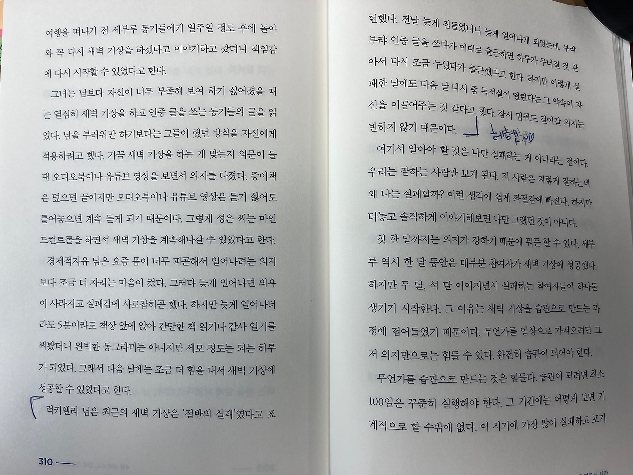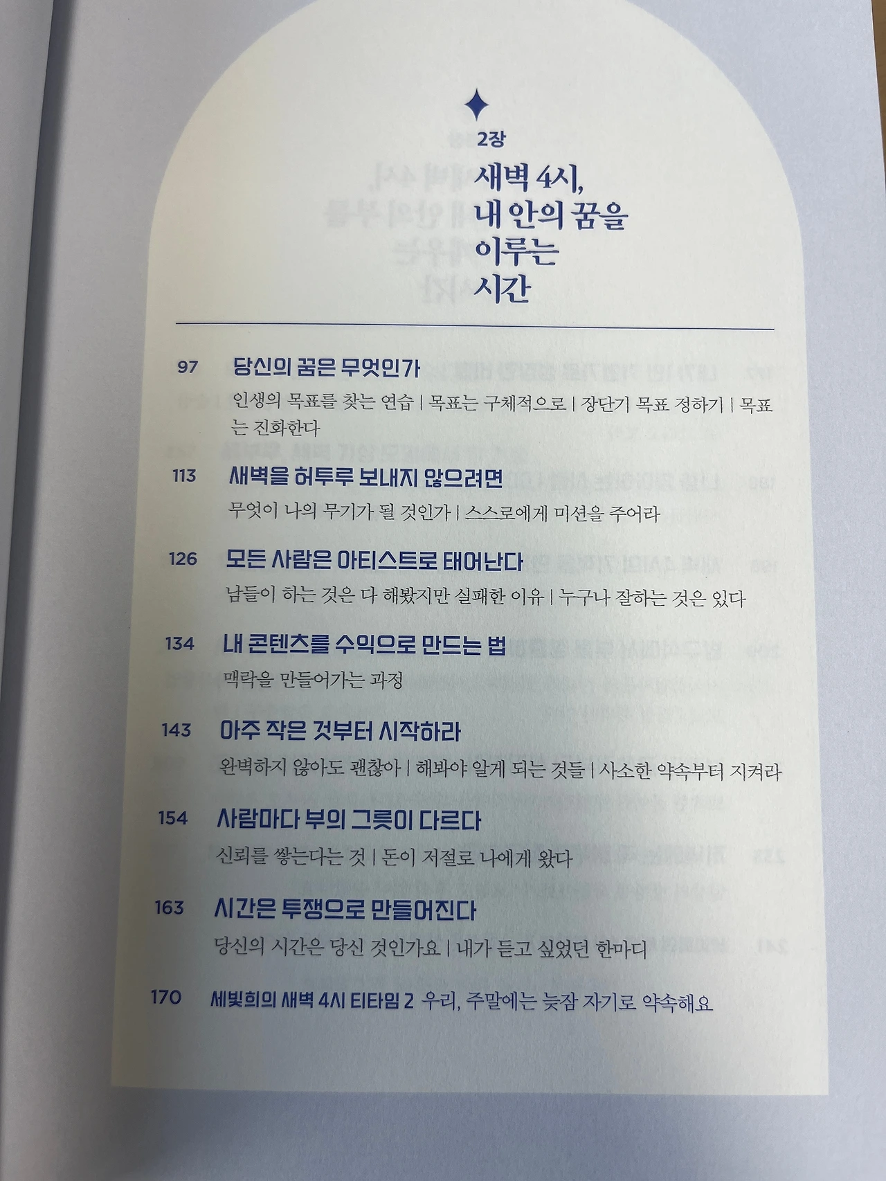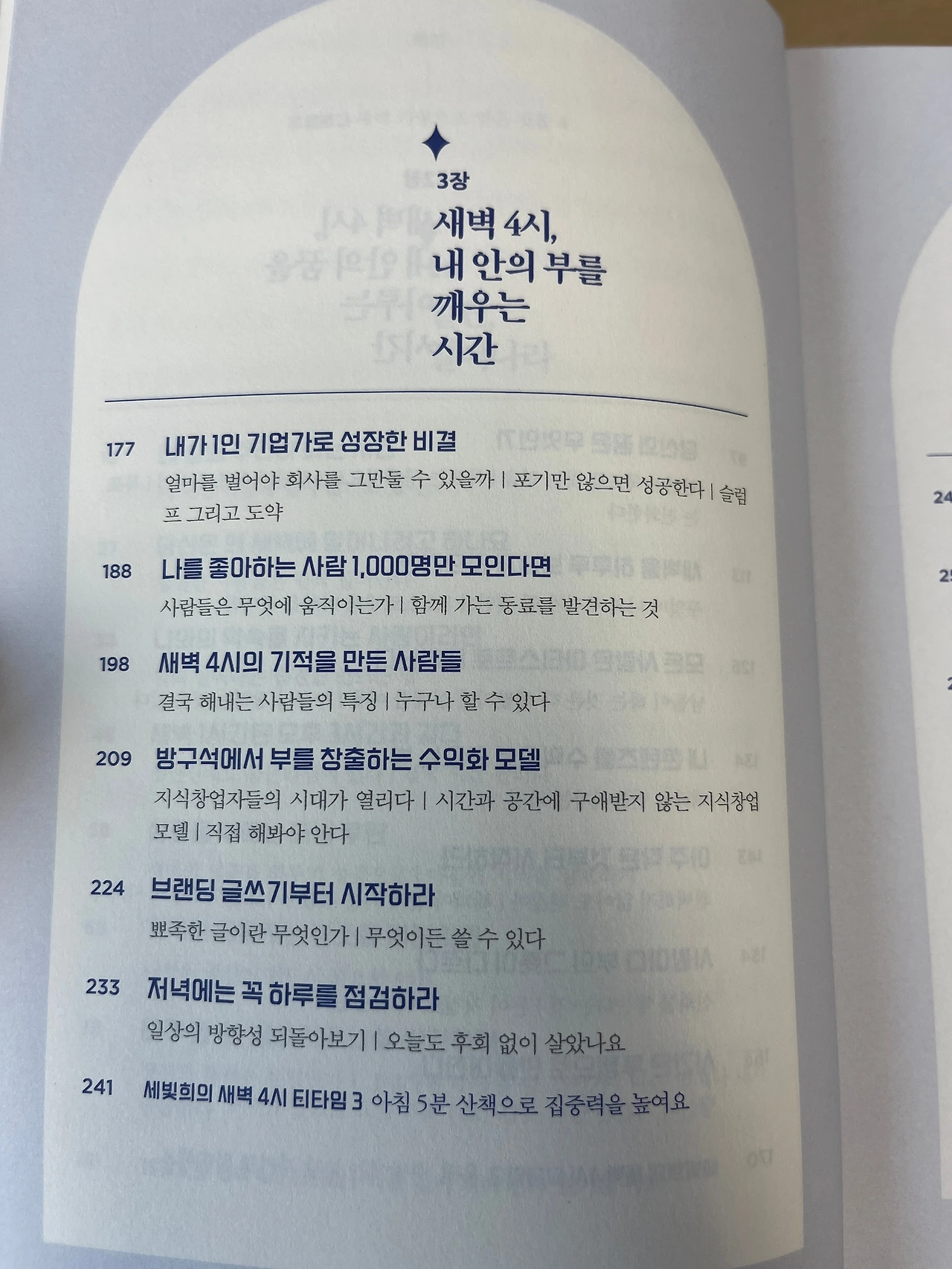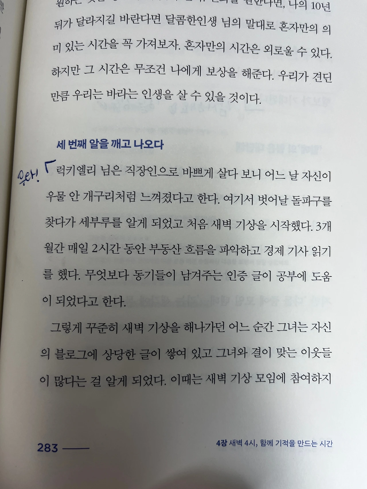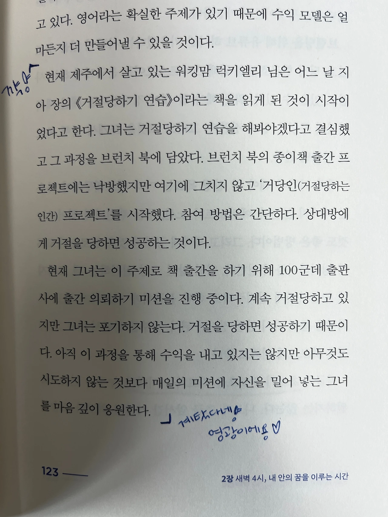 이 책은 새벽의 선물 뿐만 아니라, 그녀가 경험한 모든 것을 나눠주고 싶어하는 그 마음이 전해지는 따뜻한 자기계발서다. 책의 일부에 소중하게도 내 이야기도 언급해 주셔서, ‘거당인(거절당하는 인간) 프로젝트’도 나온다. 와우 나 정말 계탔다!!