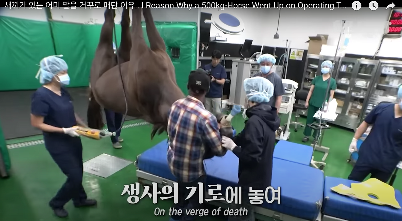 입사 초기에 종종 꾸던 꿈이었다. 때는 2005년, 말에 대해서 아무것도 모르던 나는 경마 회사에 입사하게 되었다. 여러가지 일을 했으며, 그 중에서 수술실에서의 나의 첫 역할은 말의 마취하는 선생님의 보조 역할이었다. 마취자는 말에게 진정제 약물을 투약한 후, 전마취실로 말을 입장시키고 전마취제 주사로 말을 눕게 한다. 그 후 재빠르게 기관 튜브를 장착하고 네 다리에 호블을 건 후, 천장 위의 레일를 이용하여 네 다리가 거꾸로 매달린 채 말은 수술실로 입장한다. 그 후 전신 호흡 마취기를 걸고 마취가 안정되면 수술이 시작된다.