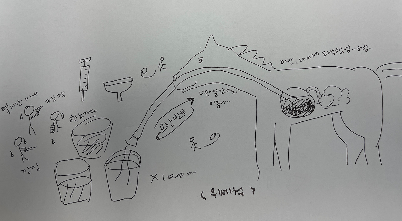 엄청 먹은 풀때기로 위가 꽉 찼다. 배가 아파서 데굴데굴 구르다 호전이 없어 결국 응급으로 말이 내원했다. 호스를 넣어서 물로 희석해서 내용물을 빼내면 된다. 방법은 심플하나 절대 심플하지 않다. 너는 걸리버, 우리는 소인이다 보니, 할 게 너무 너무 많다는 것이지. 끝도 없이 위세척하다 깜깜해진 밤이 되었다. 말은 속이 편해지며 눈이 살아났고, 우리는 오밤중까지 쫄쫄 굶으며 핵노가다 하다 눈이 퀭해졌다. (이어작성 예정)