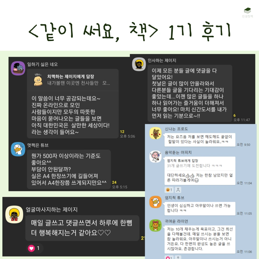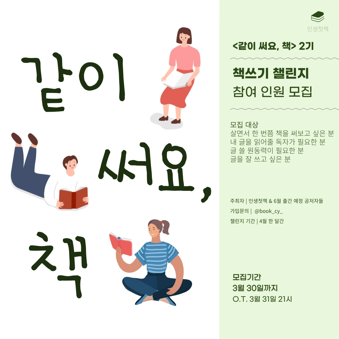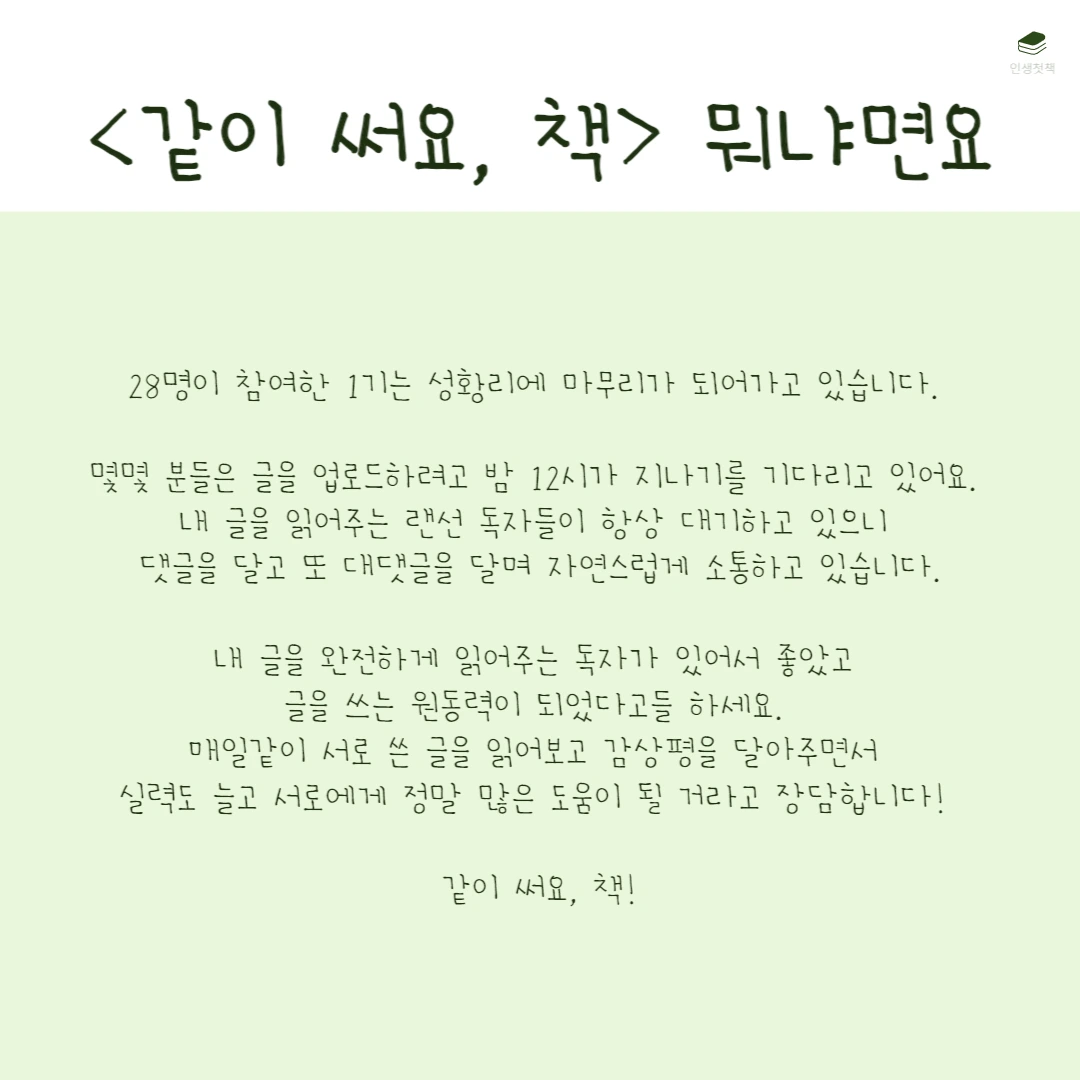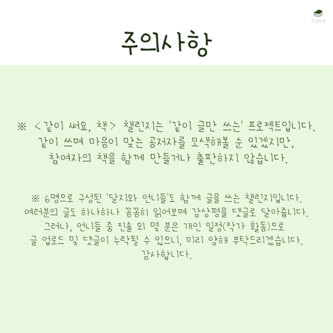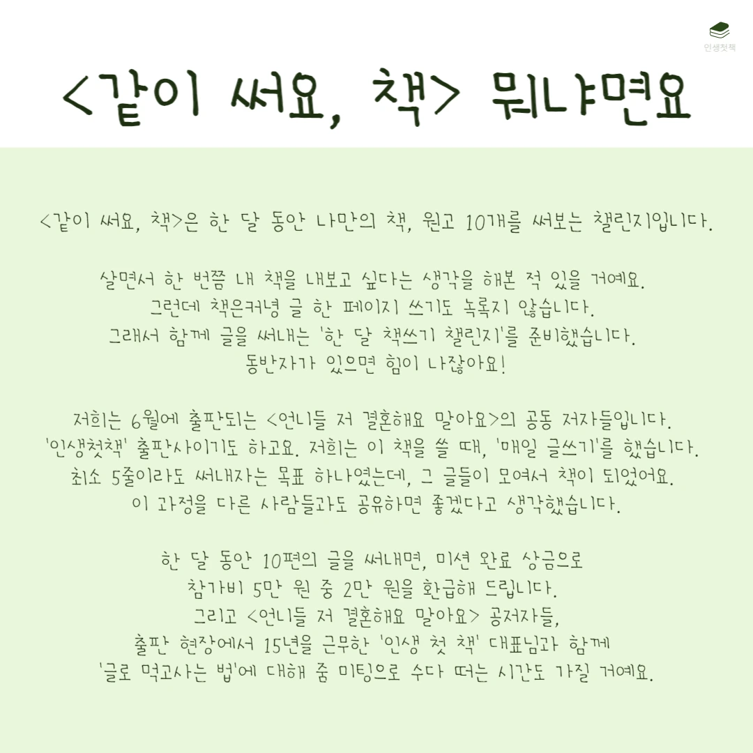 <같이 써요, 책>은 한 달 동안 언젠가 내가 쓰고 싶은 책의 원고 10개를 써보는 챌린지입니다. 살면서 한 번쯤 내 책을 내보고 싶다는 생각을 해본 적 있을 거예요. 그런데 책은커녕 글 한 페이
