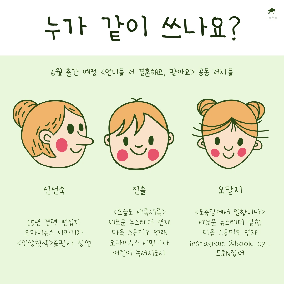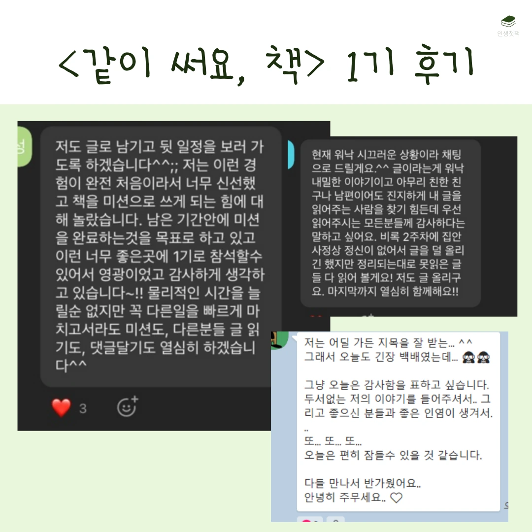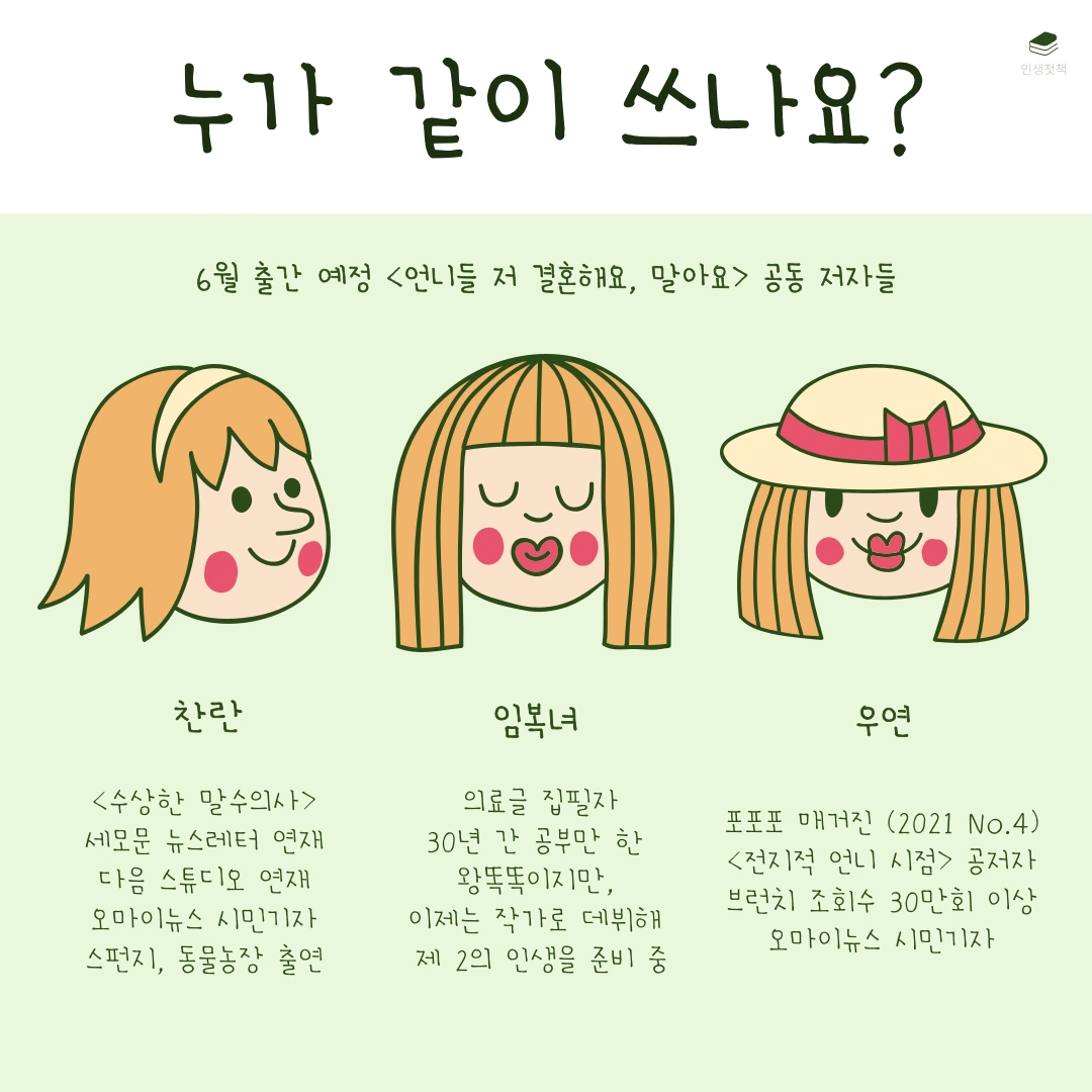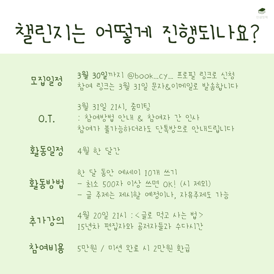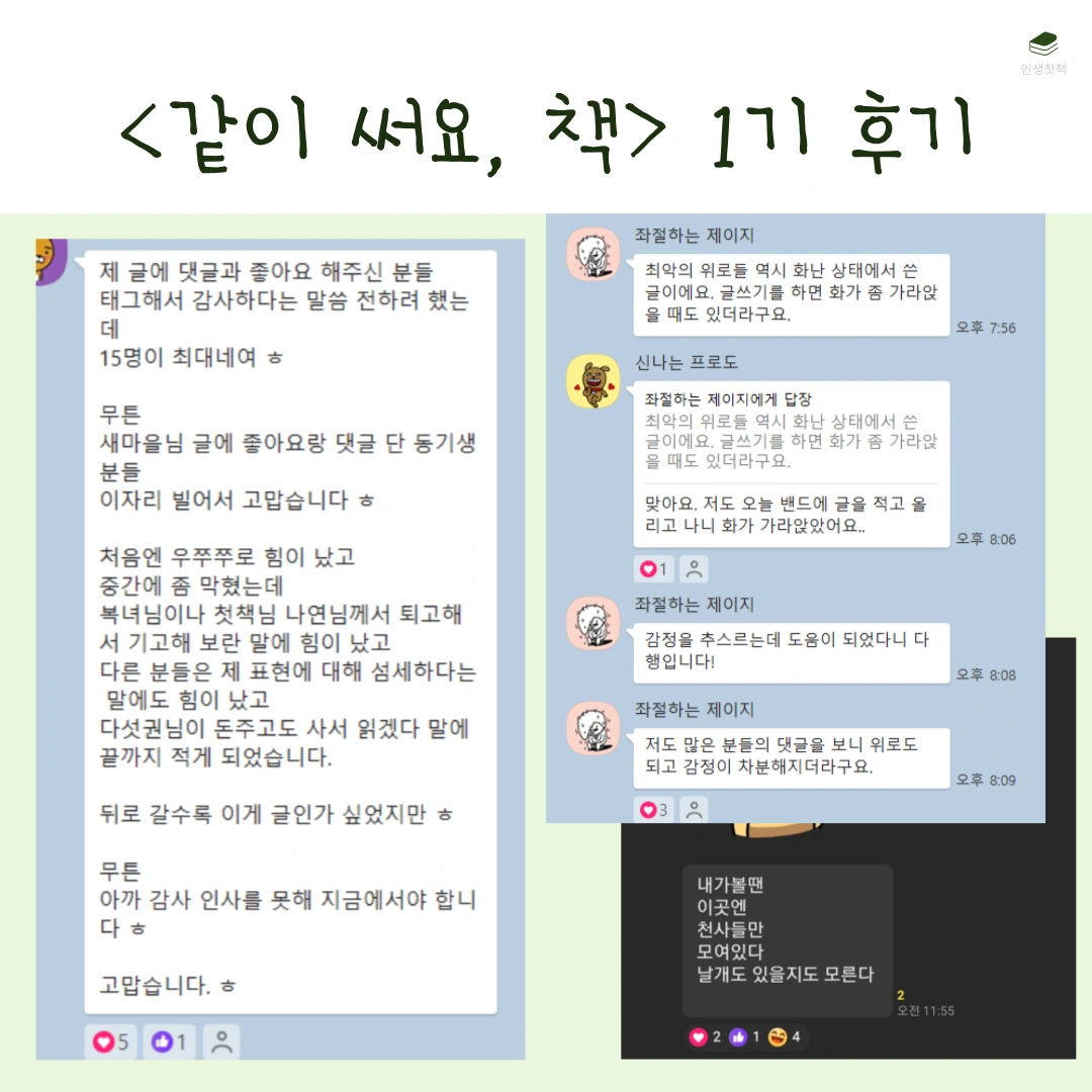 <같이 써요, 책>은 한 달 동안 언젠가 내가 쓰고 싶은 책의 원고 10개를 써보는 챌린지입니다. 살면서 한 번쯤 내 책을 내보고 싶다는 생각을 해본 적 있을 거예요. 그런데 책은커녕 글 한 페이