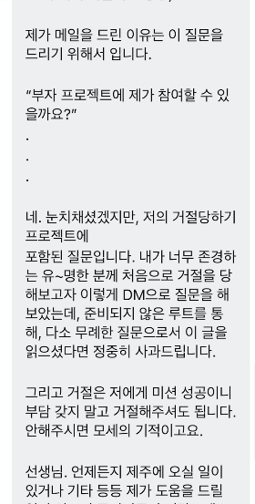 현재 샤이니 샘이 이끌고 있는 부자 프로젝트 모임이라는 것을 보았다. 현재는 모집 공고도 없고 내가 수도권에 살지도 않는다. 따라서 나는 거절당하는 게 자명하다. 그럼에도 불구하고, 이건 거절을 당해야 성공하는 미션이니깐 미션의 성공을 위하여 메시지를 보내보기로 한다. 흠. 일단 연락방법을 전혀 모르겠다. 고백컨데 나는 팬심 대비 온라인에서는 댓글 한번 잘 안 달아본 샤이 구독자이다. 연락 경로를 전혀 모르겠어서, 내 인스타그램 계정을 만든 다음 인스타 DM으로 보내보기로 했다. 어떻게 보내는지 몰라서 보내는 방법을 검색하고 있자니 디지털 문맹인 나는 바로 현타가 오며 어차피 거절당할 거 괜한 시간낭비라고 하지 말라고 내 안의 내가 속삭였다.