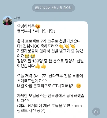 공식 일정은 끝났지만 지금도 우리 그룹은 포스트 한다로 모임을 이어가며 매일매일 'Day by day, in everyway, I'm getting better and better.'를 실행하며 돈독히 서로의 성장을 응원하며 지내고 있다. 강압과 불평이 가득한 주위 환경 속에서 찌그러져 살던 내가 선생님과 크루들 만나고 많이도 바뀌었다. 아무리 생각해도 이건 기적이다. 거절 미션을 알게 해 준 나의 샤이니 선생님을 만나게 된 것도 영광인데, 그 덕분에 나는 다른 공간과 시간을 살아가지만 나와 결이 같은 다양한 크루들을 만나게 되었고, 이야기를 나누며 내 생각도 커져가고, 또 그러면서 기존의 사람 정리가 자연스럽게 되면서 올해 내 운이 통째로 바뀌어 감을 느낀다. 나는 이렇게 만들어진 관계의 끈을 소중히 여기며 잔잔히 함께 걸어갈 것이다. 머지않은 날에 샤이니 샘과 크루들 초대해서 파란 잔디의 제주에서 골프 라운딩도 하고, 바다도 실컷 보며 비행기 시간 걱정 없이 지칠 때까지 밤새 웃고 이야기하며 서로의 미래를 같이 그리는 어느 유쾌한 날을 미리 생생하게 그리고 있다.