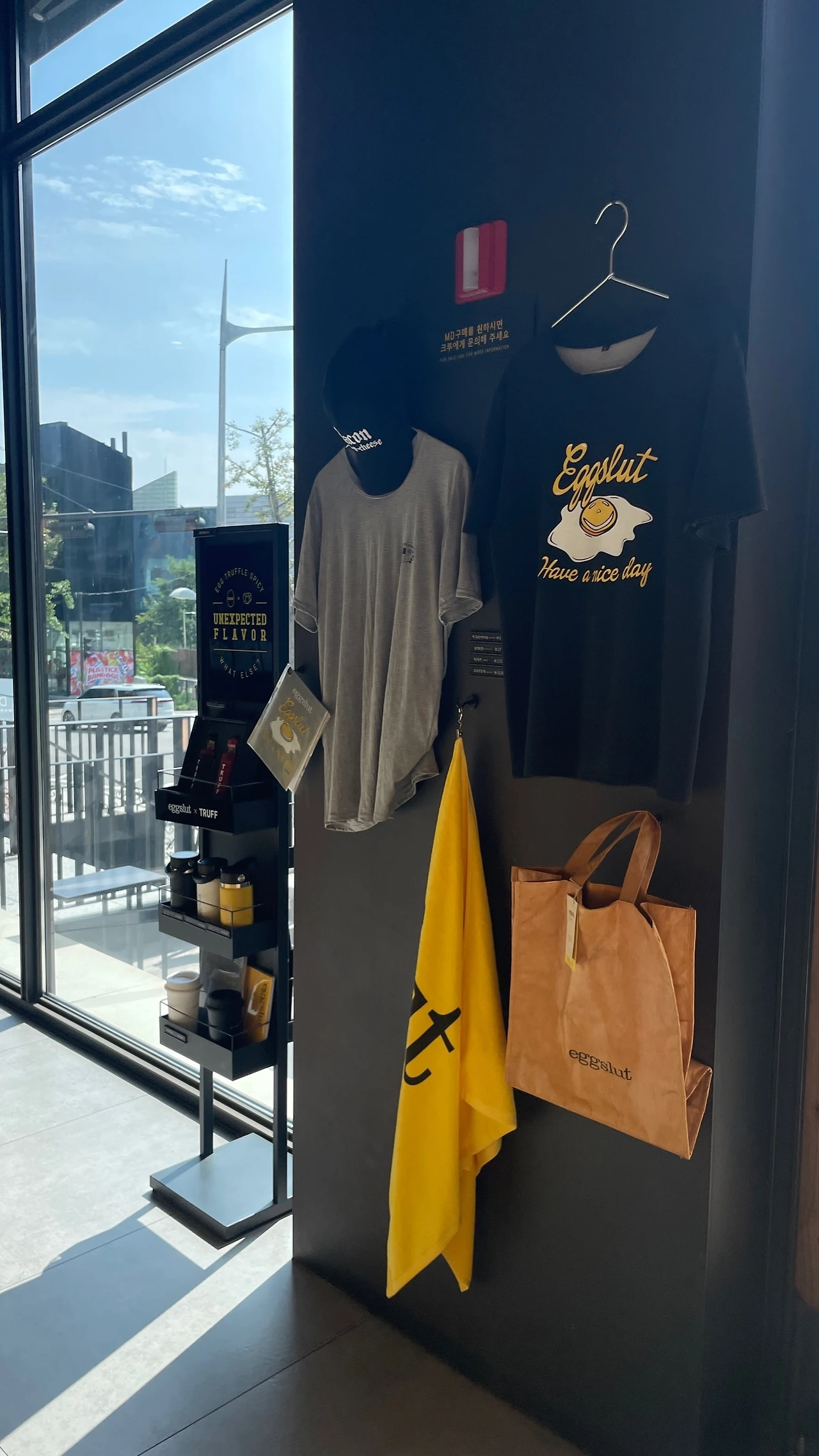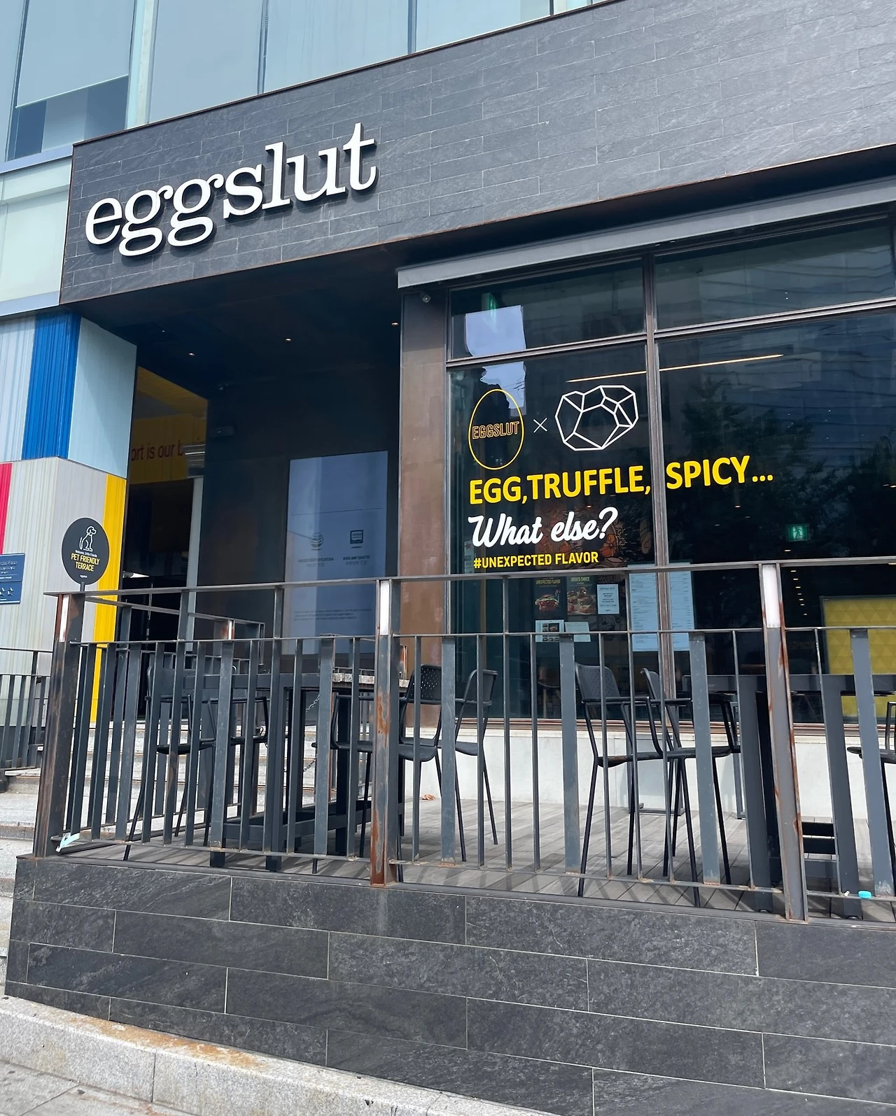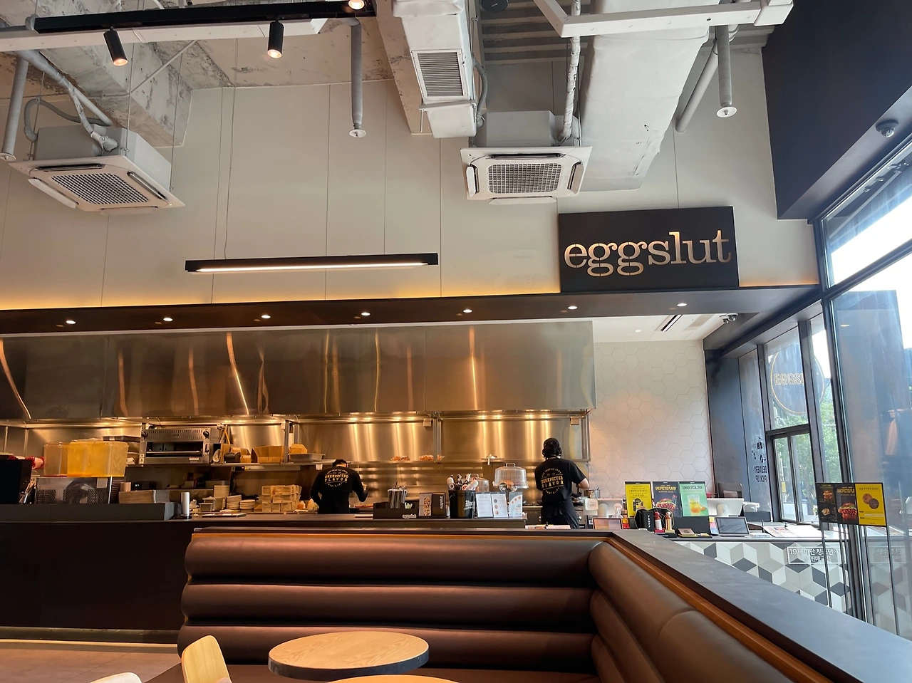 대로변에 위치한 <에그슬럿>은 고급 패스트푸드점 같은 느낌이다. 웅장한 매장 규모 때문도 그렇지만, 블랙의 키컬러를 사용한 인테리어가 고급스러운 이미지를 더한다. (로고뿐만 아니라 벽, 소파, 테이블의 테두리까지 검은색이다!) 햄버거 가격도 비교적 고가로 책정되어 있는데, 매장 내 비치된 리플릿이나 홈페이에 담긴 ‘동물 복지 계란’, ‘파인다이닝 정신을 계승’ 등의 메시지를 통해서도 하이엔드 포지션을 엿볼 수 있다.