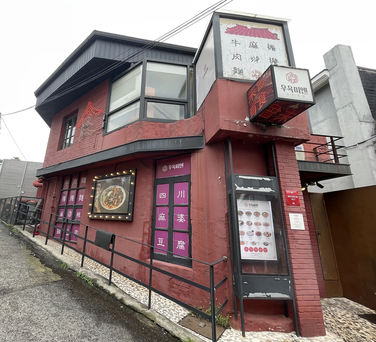 부자 피자를 넘어 조금 더 깊숙한 골목으로 들어서면 <우육미엔> 매장을 발견할 수 있다. 빨간 건물로 들어서면 인상적인 벨벳의 노란 커튼을 거쳐 한문 간판이 ‘대만’을 물씬 느껴지게 한다. 가격은 매우 저렴한 편에 속하는데(우육미엔의 가격이 8,500원, 새우어향가지가 8,000원), 음식 퀄리티는 대만의 친근한 노상 매장으로 형성되어 있고, 인테리어는 고급 레스토랑의 포인트가 접목되어 있다. 아마도 우육미엔의 포인트는 저렴한 가격으로 경험하는 대만의 맛이 아닐까. 개인적인 소감으로는 음식 퀄리티를 조금 높여 인테리어와 동일한 포지션으로 올려둔다면, 대만의 깊은 맛을 느끼고 싶은 사람들의 니즈를 채울 수 있을 것 같다.
