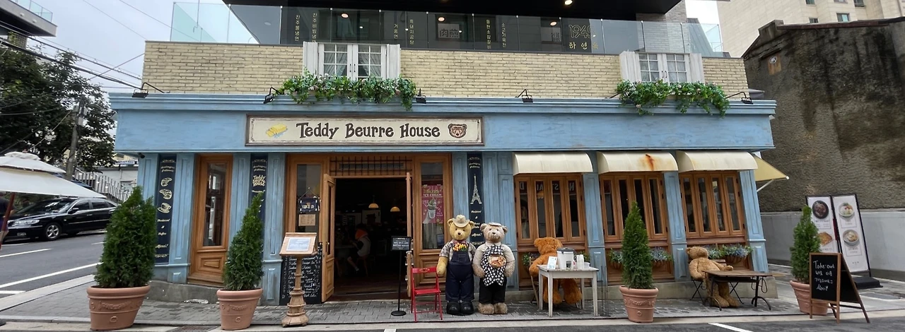 용리단길을 걷다, 유독 긴 웨이팅 줄과 사람들로 붐비는 매장을 발견했다면, <테디뵈르하우스>이다. 매장에 들어가기 위한 웨이팅 줄과 건물 외벽에서 사진을 찍고 있는 사람들로 도로부터 인산인해를 이루고 있다. 건물 전체 외관에 사용된 파스텔톤의 색감과 사람만 한 곰인형들이 파리의 아기자기한 매장을 연상시켜 인증샷욕망을 불러일으킨다.