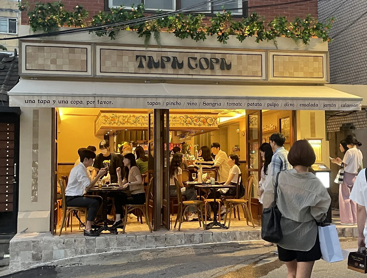 타파코파에는 ‘타파스와 술을 통해 스페인의 정취를 담아내고자’ 하는 의도를 공간 요소를 통해 표현하고 있다. ‘tapa(타파스)와 copa(한 잔의 술)’의 뜻을 담은 브랜드명, 외부 어닝에 적힌 ‘Una tapa y una copa, por favor(타파스 하나와 술 한 잔 주세요)’와 매장 내부에 적힌 ‘Tomemos una copa todos(자, 모두 한잔합시다)’라는 메시지, 1인 1주류 주문인 운영시스템(지하 매장) 등에서 컨셉을 알 수 있다.