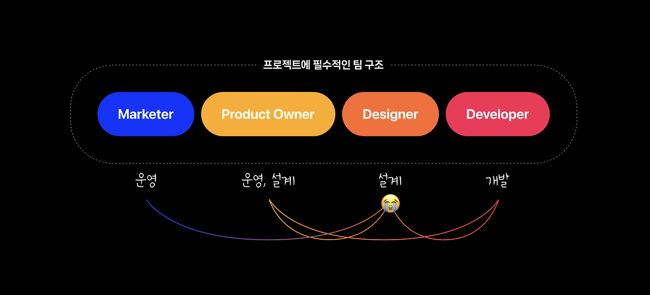 프로젝트에 필수적인 팀 구조는 크게 봤을 때 마케터, P.O, 디자이너, 개발자의 묶음으로 이루어져 있다.