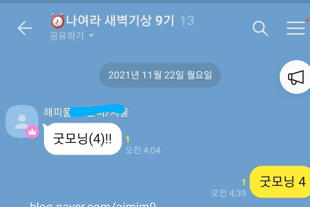 다시 잠드는 경우가 많아서, 일어나서 한참 후에 모닝인사 인증을 한다.