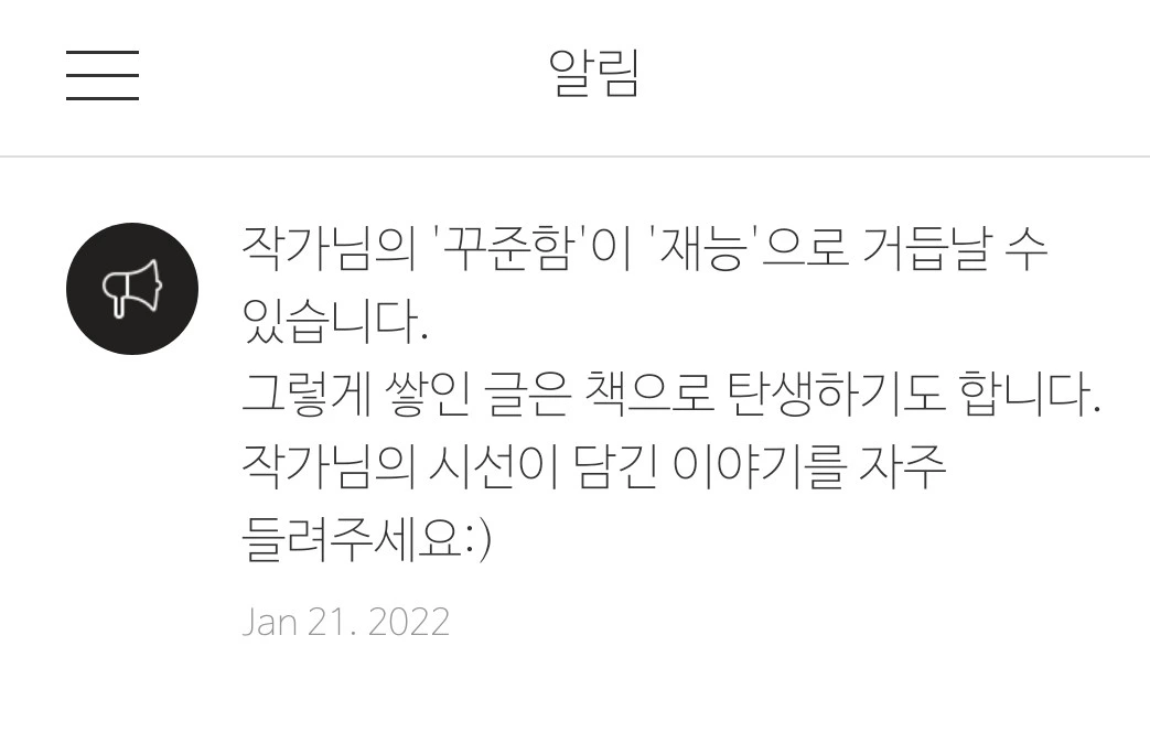 새벽에 잠이 오지 않아 오랜만에 브런치 앱에 접속했다. 예상했던 그 알림이 들어와 있다.몇 주에 한 번도 글을 올리지 않으면 뜨는 메시지이다. 매혹적인 ‘작가님’, '재능' , '책'이란 단어에 더 이상 흔들리지 않는다. '꾸준함'이란 단어에 불안해져 블로그 앱을 열어 글쓰기 버튼을 클릭한다.